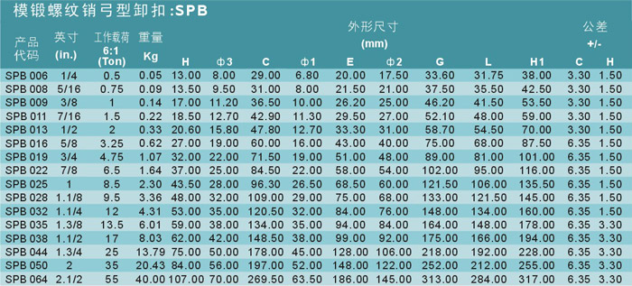 艾培尔SPB型6倍强力型卸扣参数:
